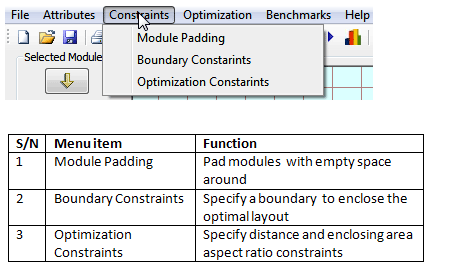 1. “Type”, “Mobility” and “Orientation” properties of a module may be modified by clicking the cells in the respective columns. 2. “Area” is automatically calculated for Hard modules from the user-specified Length and Width. User can modify the area for “Soft” modules. 3. “Length” (along x-axis) and “Width” (dimension along y-axis) can be modified by the user for Hard modules. For Soft modules, the user specifies the Area and the optimization algorithm determines the dimensions. 4. X-LLC and Y-LLC are the x and y co-ordinates for the Lower Left Corner of the module in the layout. User will specify them only for “Anchored” modules using the Anchor input window that opens when the user clicks the “Anchor” button. For all “Movable” modules, the X-LLC and Y-LLC are determined by the optimization algorithm of VIP-PLANOPT. 5. AR-LB is the lower bound on the aspect ratio of a module and AR-UB is the upper bound. For Hard modules, AR-LB = AR-UB and cannot be modified by the user. For Soft modules, user may modify the bounds specified by VIP-PLANOPT. 6. AR-Set is a set ID that the user may specify for Soft modules. The set will contain discrete values of the aspect ratios as required by the user. The input window for specifying sets of discrete aspect ratios can be opened by clicking the AR icon under the menu bar or by clicking “Generate Aspect Ratios” in the “Attribute” menu. |